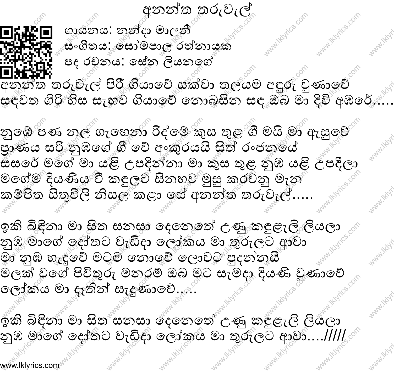 Our records indicate that Anantha Tharuwal is sung by Nanda Malani, . The lyricist of this song is Sena Liyanage. The composer of this song is Somapala Rathnayake. Anantha Tharuwal's first published year is unknown. We would like to invite you to submit it if you are aware. You can listen to this song by visiting the following youtube link: https://www.youtube.com/watch?v=u_6jTy7HcU0. Lk Lyrics is largely a community maintained application. Please feel free to use our android app or web site to submit corrections to this song.