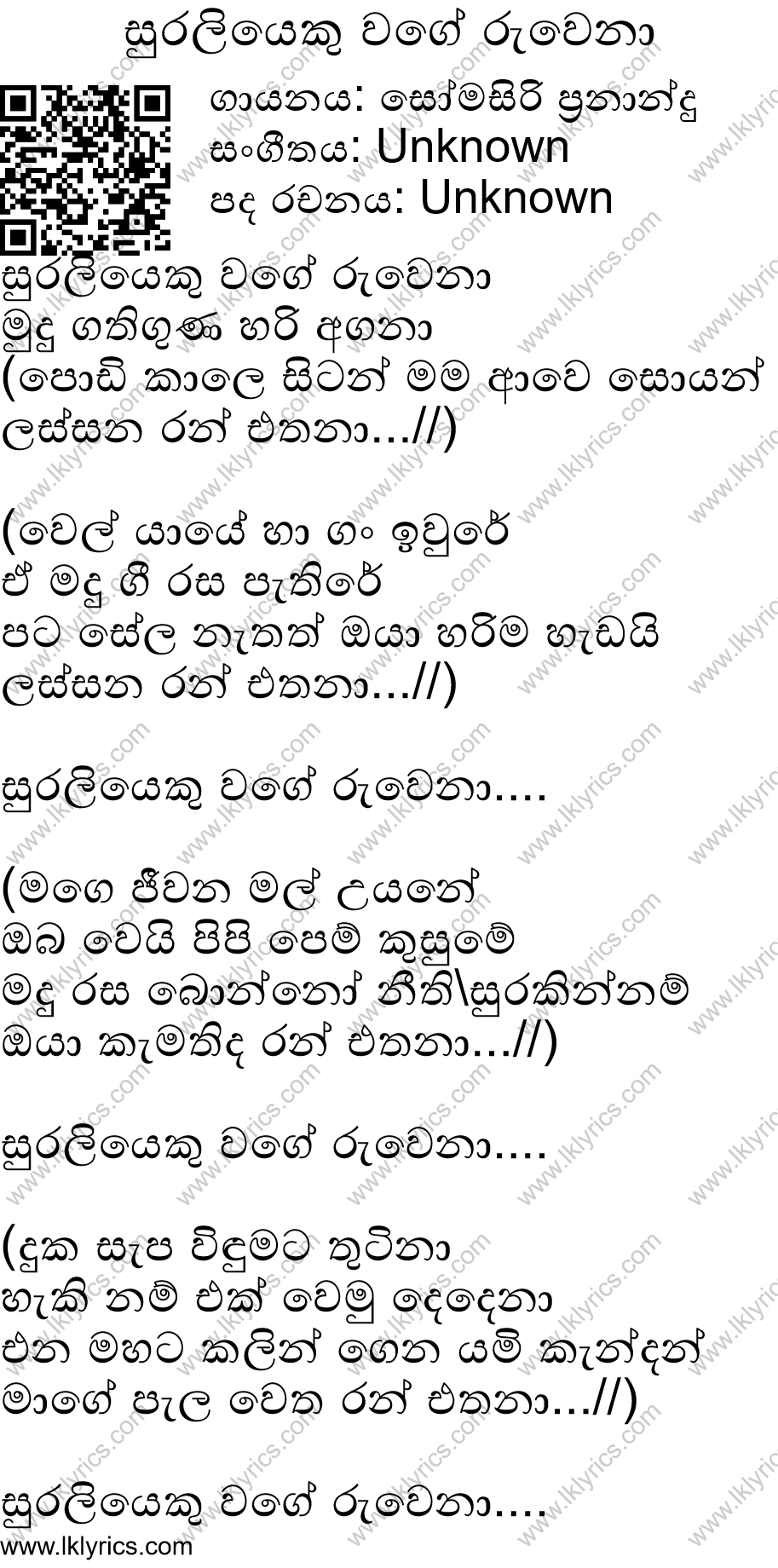 Our records indicate that Suraliyeku Wage Ruwena is sung by Somasiri Fernando, . The lyricist of this song is currently unknown. The composer of this song is currently unknown. Suraliyeku Wage Ruwena's first published year is unknown. We would like to invite you to submit it if you are aware. You can listen to this song by visiting the following youtube link: https://www.youtube.com/watch?v=XfFZN7Griwo. Lk Lyrics is largely a community maintained application. Please feel free to use our android app or web site to submit corrections to this song.
