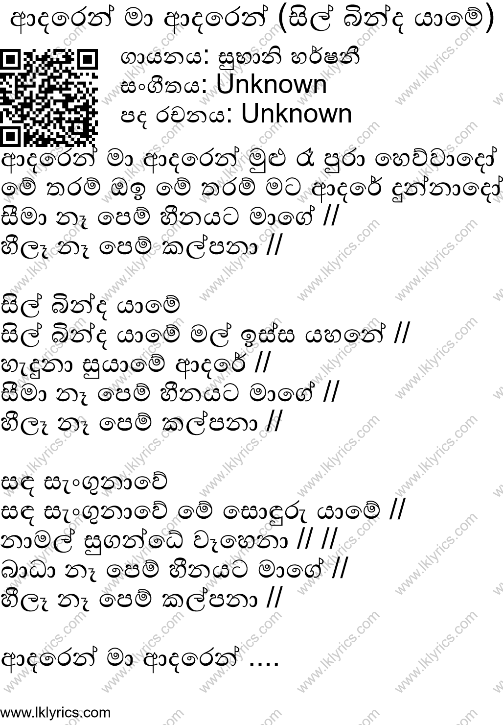 Our records indicate that Adaren Ma Adaren (Sil Binda Yame) is sung by Subhani Harshani, . The lyricist of this song is currently unknown. The composer of this song is currently unknown. Adaren Ma Adaren (Sil Binda Yame)'s first published year is unknown. We would like to invite you to submit it if you are aware. We currently do not have a youtube link to this song. We appreciate if you can submit one. Lk Lyrics is largely a community maintained application. Please feel free to use our android app or web site to submit corrections to this song.