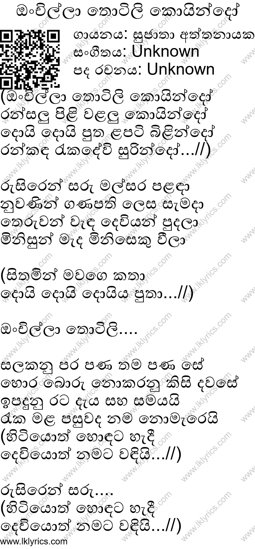 Our records indicate that Onchilla Thotili Koindo is sung by Sujatha Aththanayaka, . The lyricist of this song is currently unknown. The composer of this song is currently unknown. Onchilla Thotili Koindo's first published year is unknown. We would like to invite you to submit it if you are aware. You can listen to this song by visiting the following youtube link: https://www.youtube.com/watch?v=l2VfCP7LzxE. Lk Lyrics is largely a community maintained application. Please feel free to use our android app or web site to submit corrections to this song.