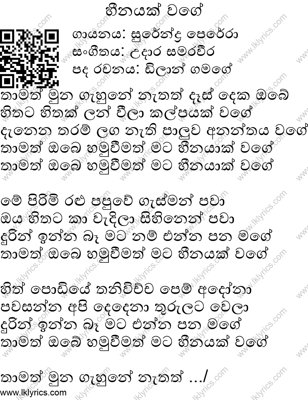 Our records indicate that Heenayak Wage is sung by Surendra Perera, . The lyricist of this song is Dilan Gamage. The composer of this song is Udara Samaraweera. Heenayak Wage's first published year is unknown. We would like to invite you to submit it if you are aware. You can listen to this song by visiting the following youtube link: http://www.youtube.com/watch?v=eY6tCVV0u30. Lk Lyrics is largely a community maintained application. Please feel free to use our android app or web site to submit corrections to this song.