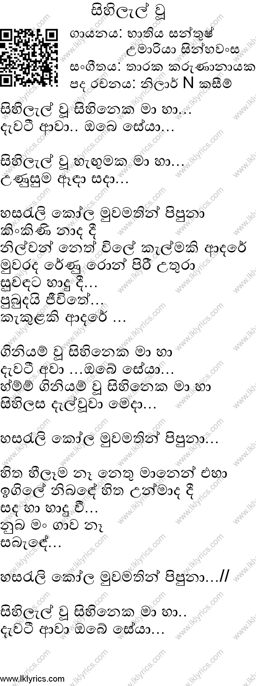 Our records indicate that Sihilel Wu is sung by Bathiya n Santhush, Umaria Sinhawansa, . The lyricist of this song is Nilar N Cassim. The composer of this song is Tharaka Karunanayake. Sihilel Wu's first published year is unknown. We would like to invite you to submit it if you are aware. You can listen to this song by visiting the following youtube link: https://youtu.be/k9Kw-PI2qrw. Lk Lyrics is largely a community maintained application. Please feel free to use our android app or web site to submit corrections to this song.