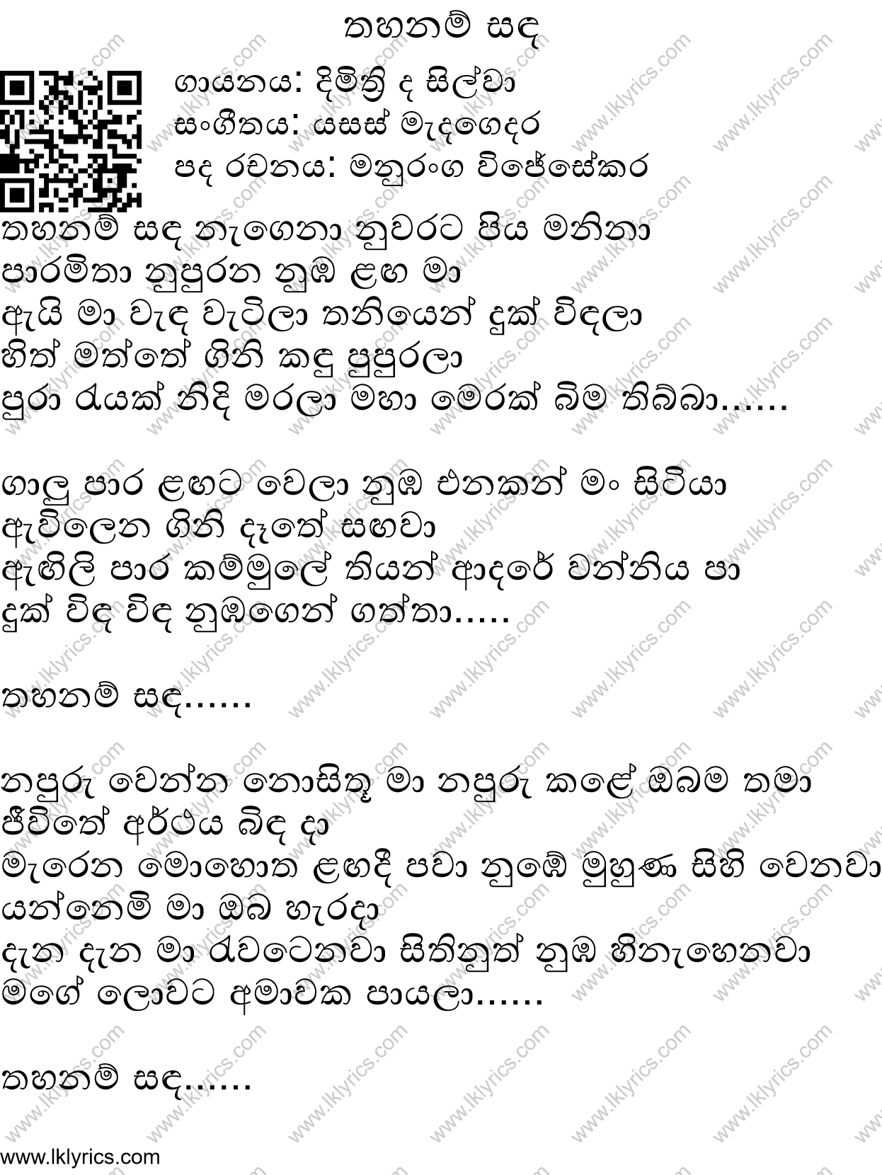 Our records indicate that Thahanam Sanda is sung by Dimitri De Silva, . The lyricist of this song is Manuranga Wijesekara. The composer of this song is Yasas Medagedara. Thahanam Sanda's first published year is unknown. We would like to invite you to submit it if you are aware. You can listen to this song by visiting the following youtube link: https://www.youtube.com/watch?v=LeuMRnK5Tko. Lk Lyrics is largely a community maintained application. Please feel free to use our android app or web site to submit corrections to this song.