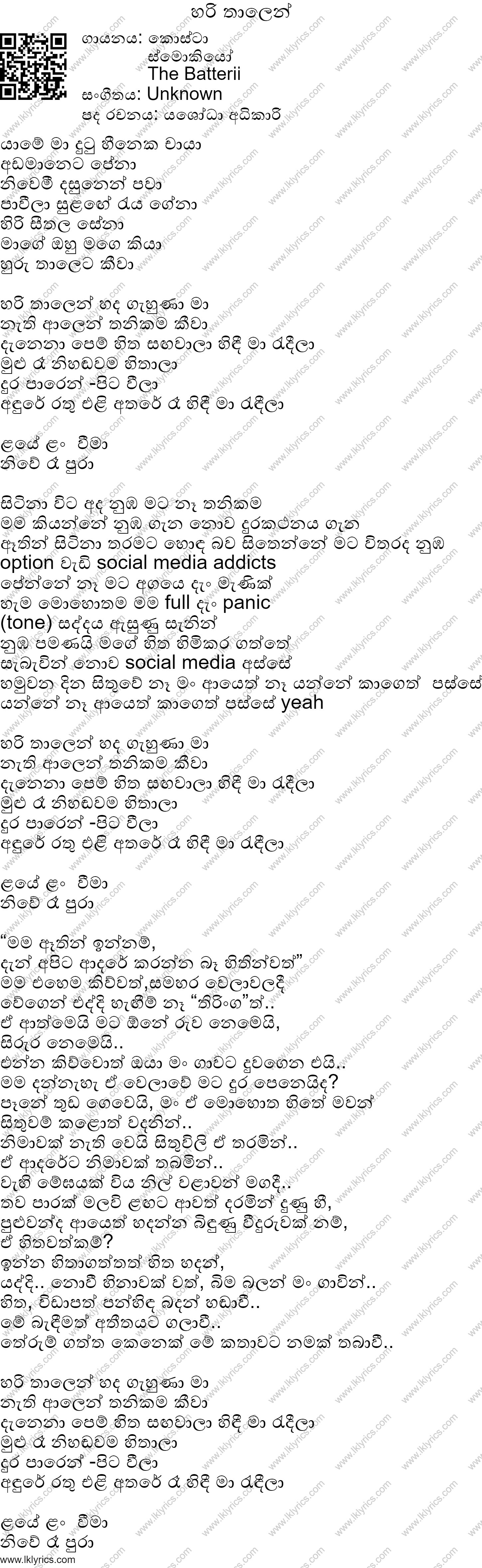 Our records indicate that Hari Thalen is sung by Smokio, Costa, The Batterii, . The lyricist of this song is Yashodha Adhikari. The composer of this song is currently unknown. Hari Thalen was first published in 2021. You can listen to this song by visiting the following youtube link: https://www.youtube.com/watch?v=11E-YrNv64Q&feature=youtu.be. Lk Lyrics is largely a community maintained application. Please feel free to use our android app or web site to submit corrections to this song.